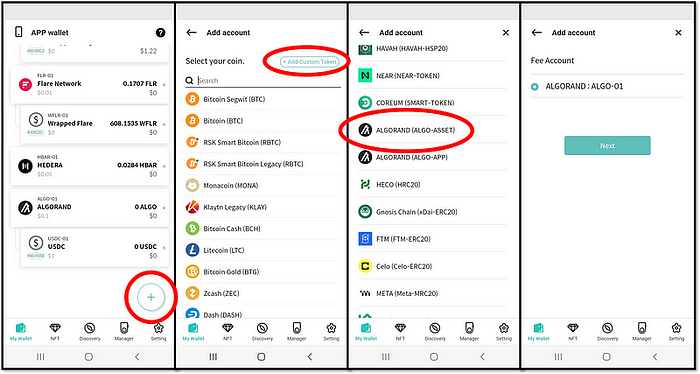 알고랜드 기반의 자산 계정을 추가하는 방법은 알고랜드 기본 자산 계정을 추가하는 방법과 동일하지만 추가적으로 네트워크 거래시 수수료를 지불할 알고랜드 기본 자산 계정을 선택해야 합니다.