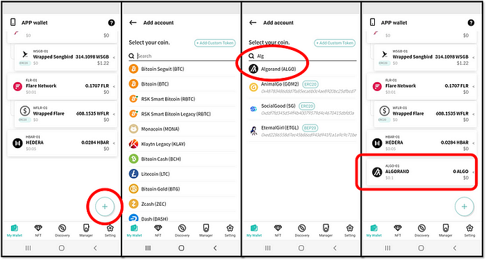 알고랜드 계정을 추가하는 것은 매우 간단합니다. My Wallet 화면에 하단의 (+) 버튼을 선택하고 목록에서 “Algorand”를 검색하여 계정을 추가 하세요.